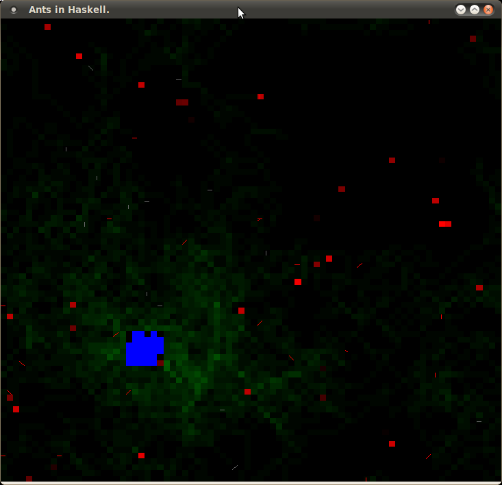 c {pheromone = pheromone c * evapRate}). Laziness means that this isn't evaluated fully, which means it keeps a reference to the previous value of the cell. I'm not interested in the value, but because there is a reference to it, the runtime can't though the value away. Time for some strictness annotations. Note that I've also done a few refactorings (the World data type was just a wrapper around Vector, so I got rid of the wrapper, and typing pheromone in 100 times was driving me nuts).The